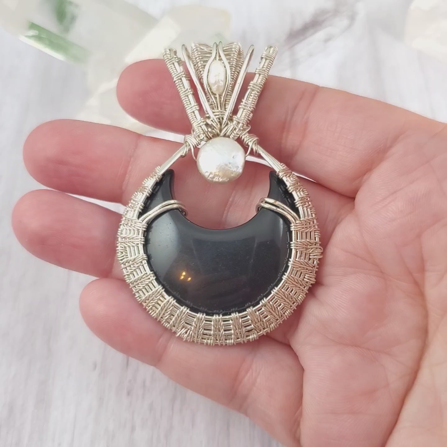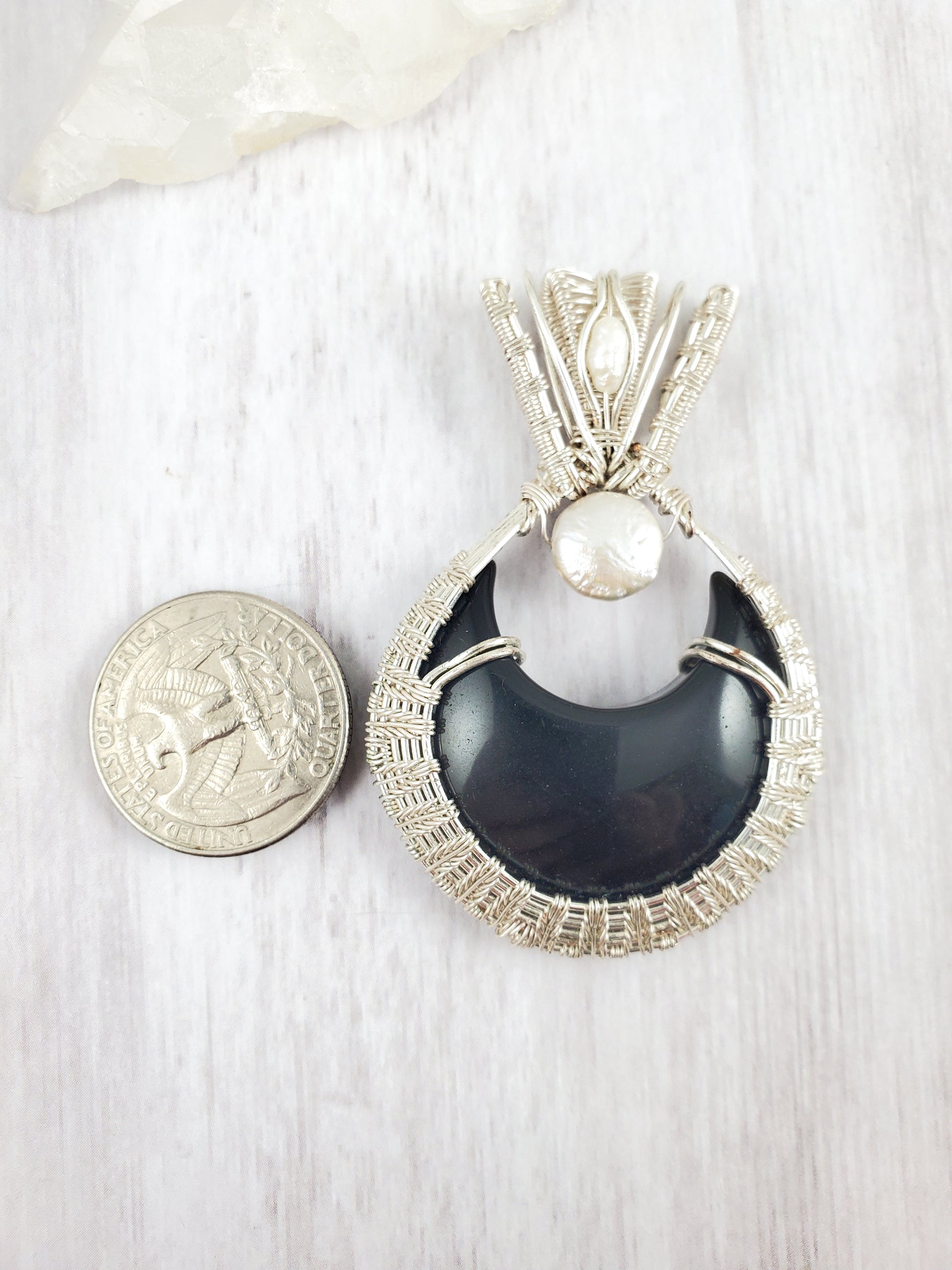 This beautiful pendant has a black obsidian crescent moon cabochon wrapped in silver tone, tarnish-resistant copper wire, and accented with freshwater pearls.