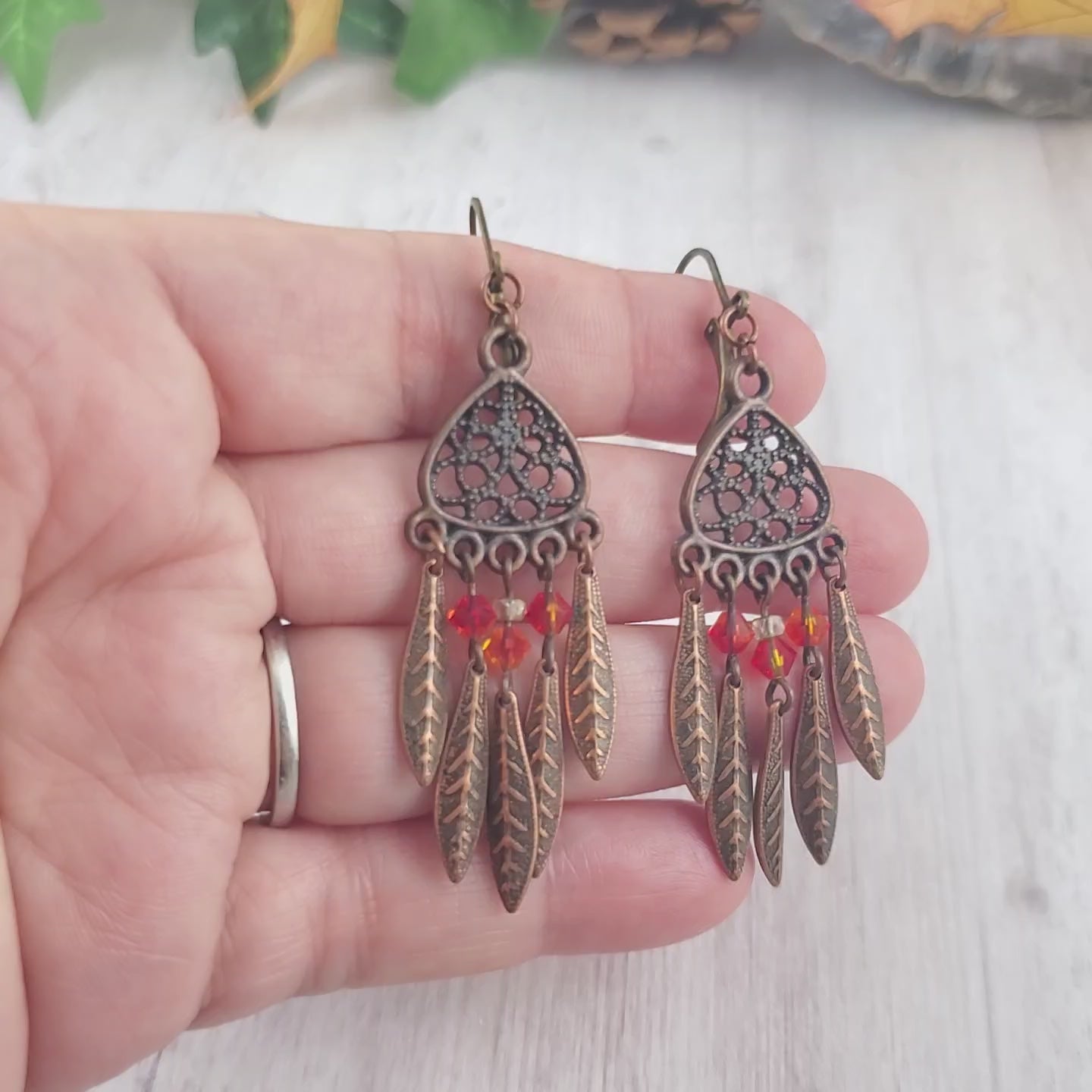 Copper Feather and Swarovski Chandelier Earrings Orange