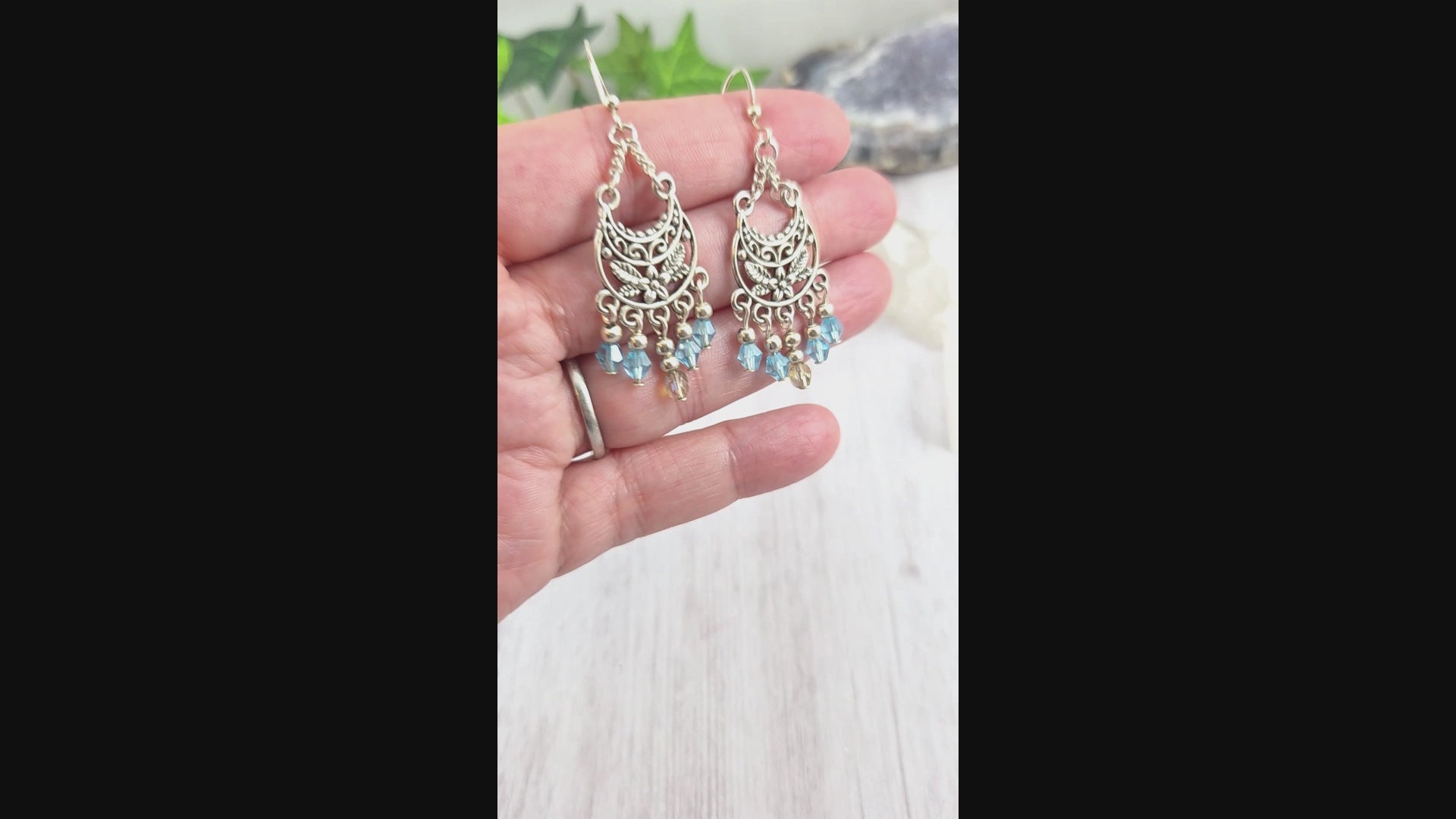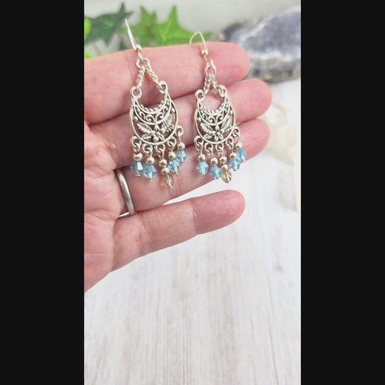 Spritely blue, grey and silver flower chandelier earrings. These are so fun! Nickel free plated brass French wires.