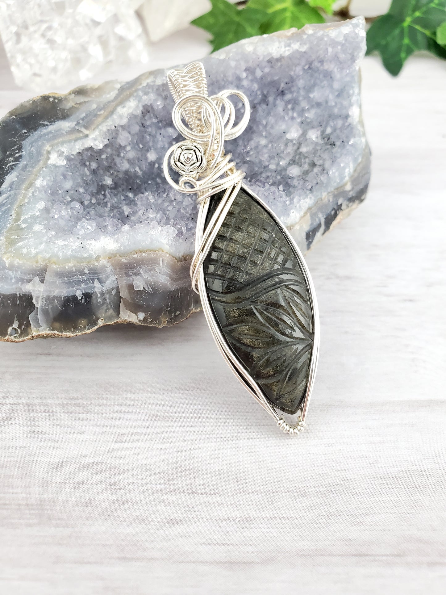 This silver sheen obsidian piece has a carved leaves and checks pattern - beautiful chatoyant sheen in the light! Wrapped in tarnish resistant silver-plated copper wire with a silver-plated flower accent bead.