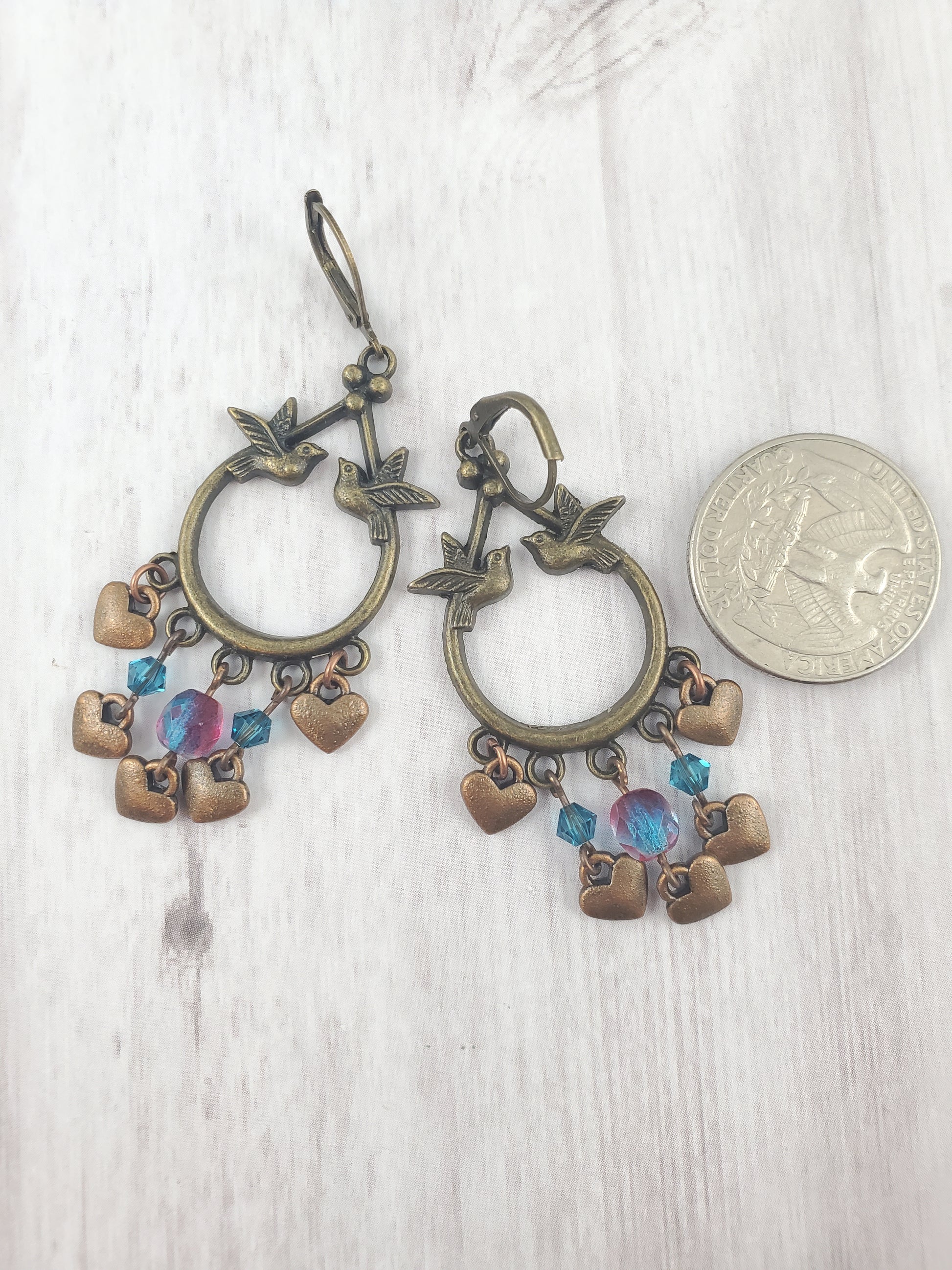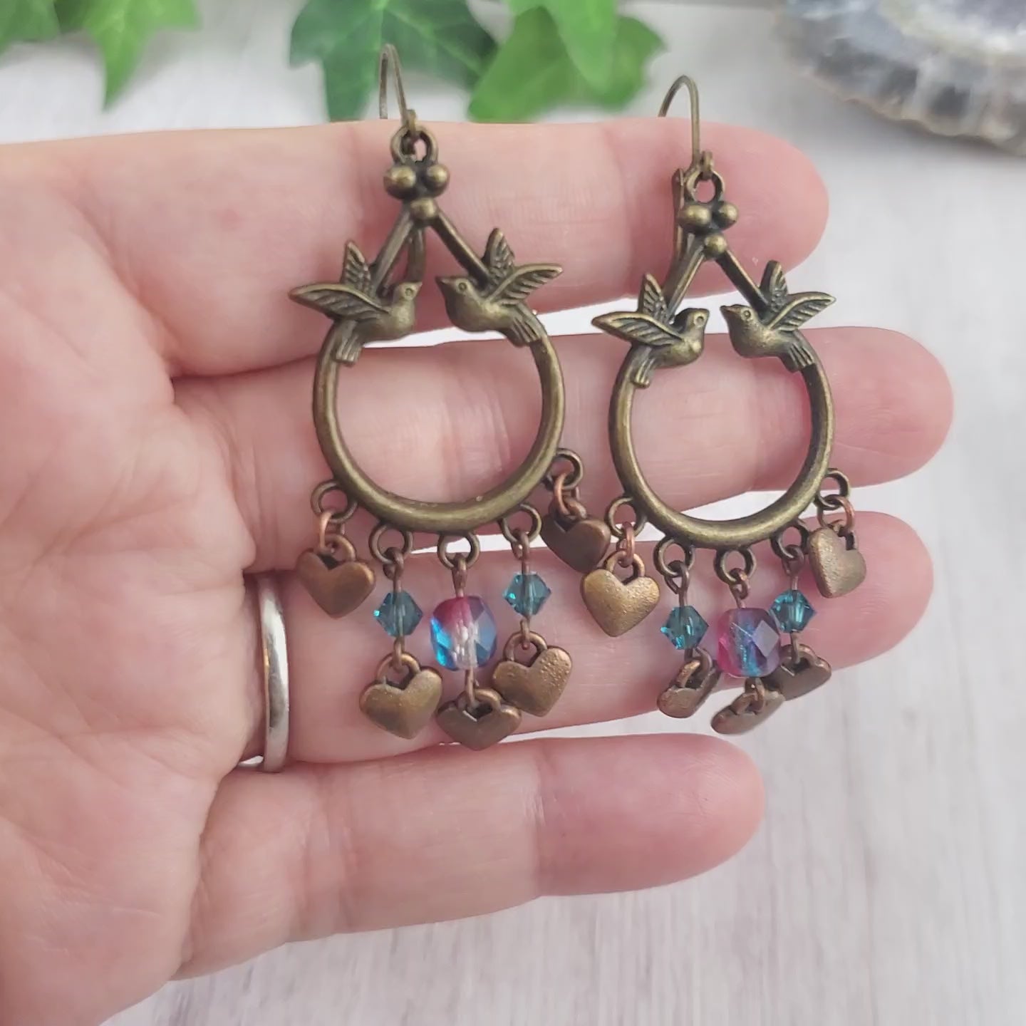 Fun antique bronze love birds earrings with Czech and Swarovski accents. Unknown metal leverbacks.