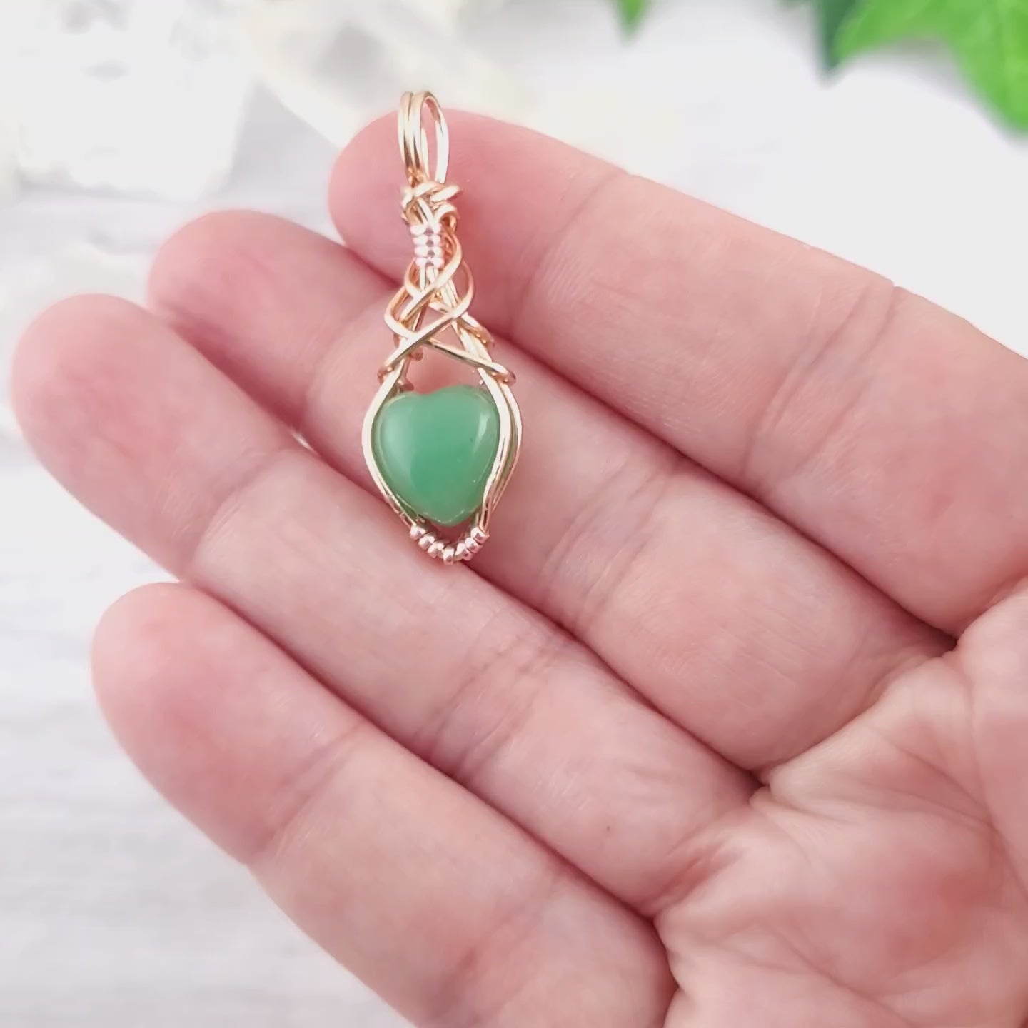 Sweet little adventurine heart is wrapped in tarnish-resistant rose gold tone copper wire.