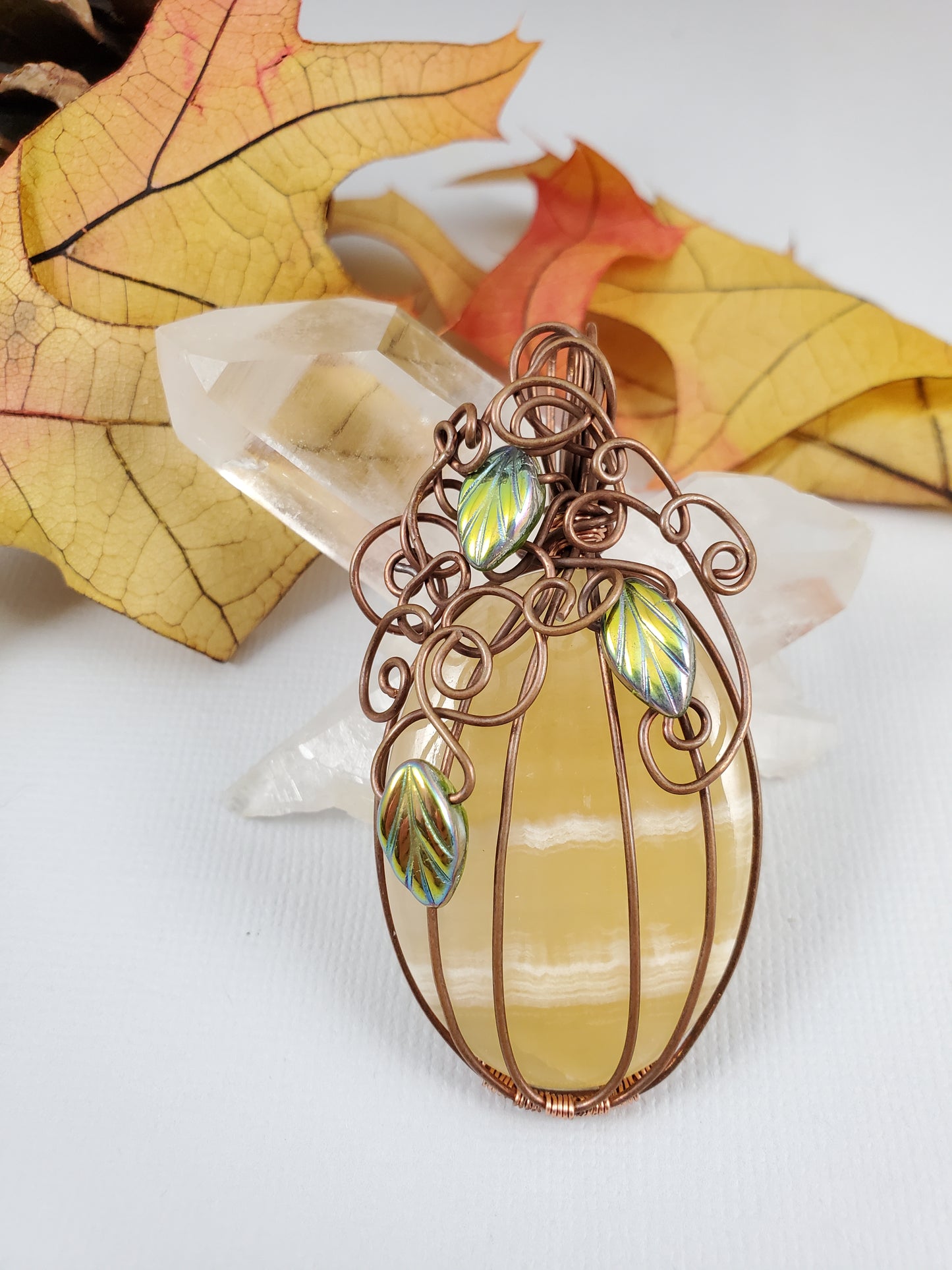 Beautiful banded calcite pumpkin pendant wrapped in natural copper. Czech 'Olive Vitrail' pressed glass leaves.