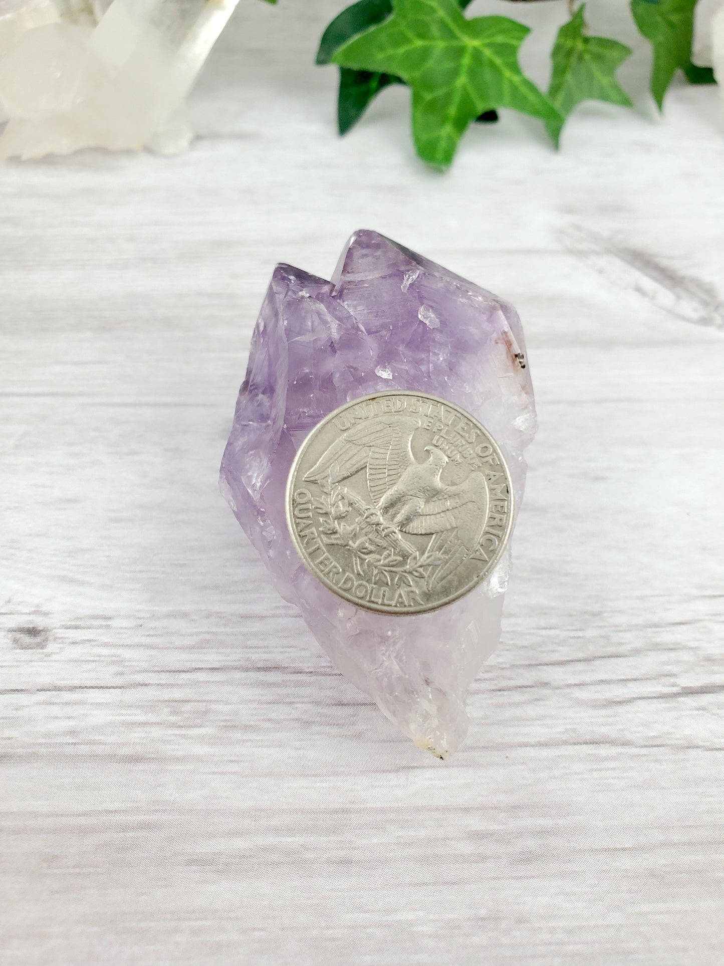 This rough beauty has three terminations and some etching. Points aren't perfect, but the color is lovely! Has some (I believe, hematite inclusions).