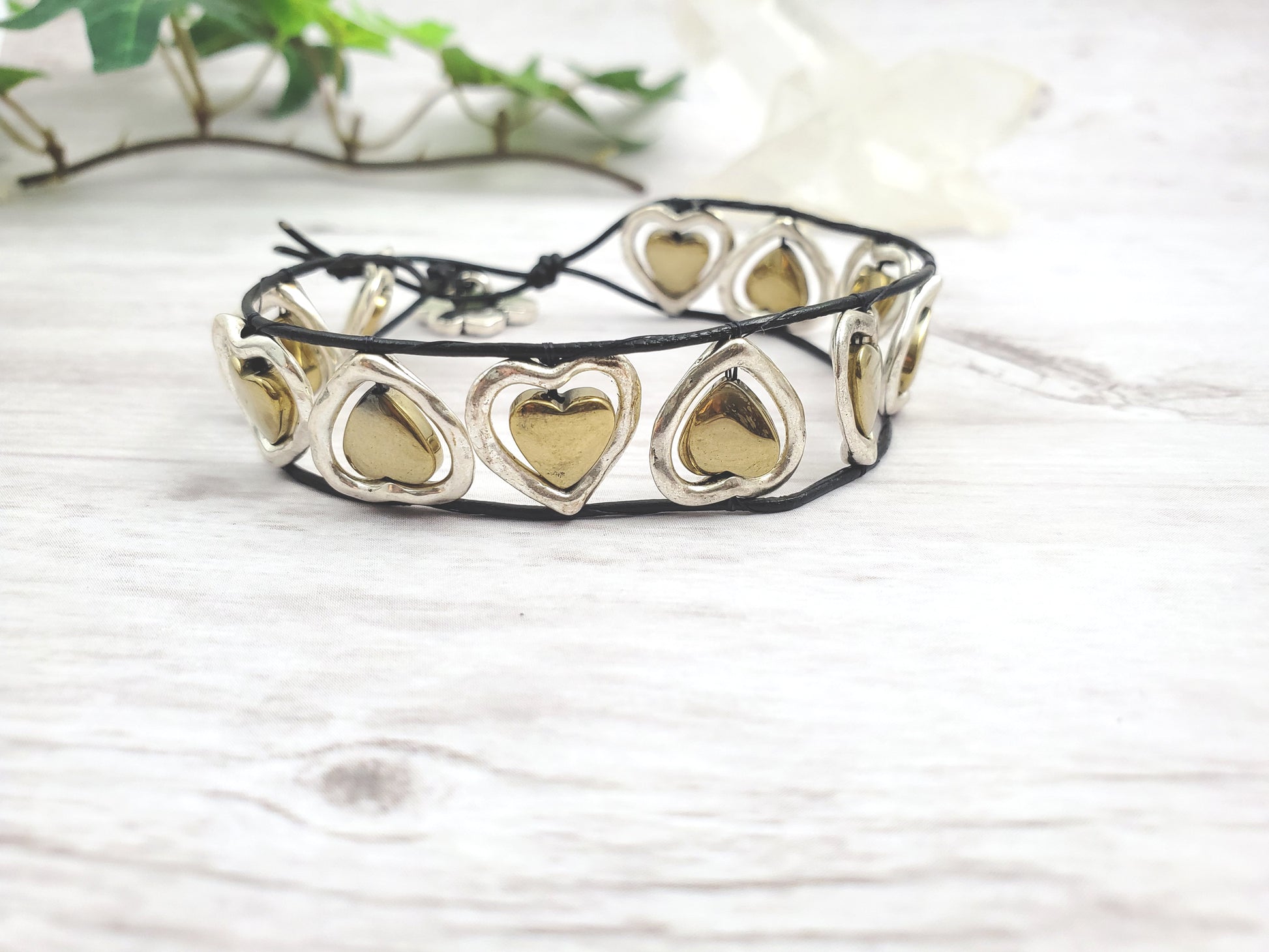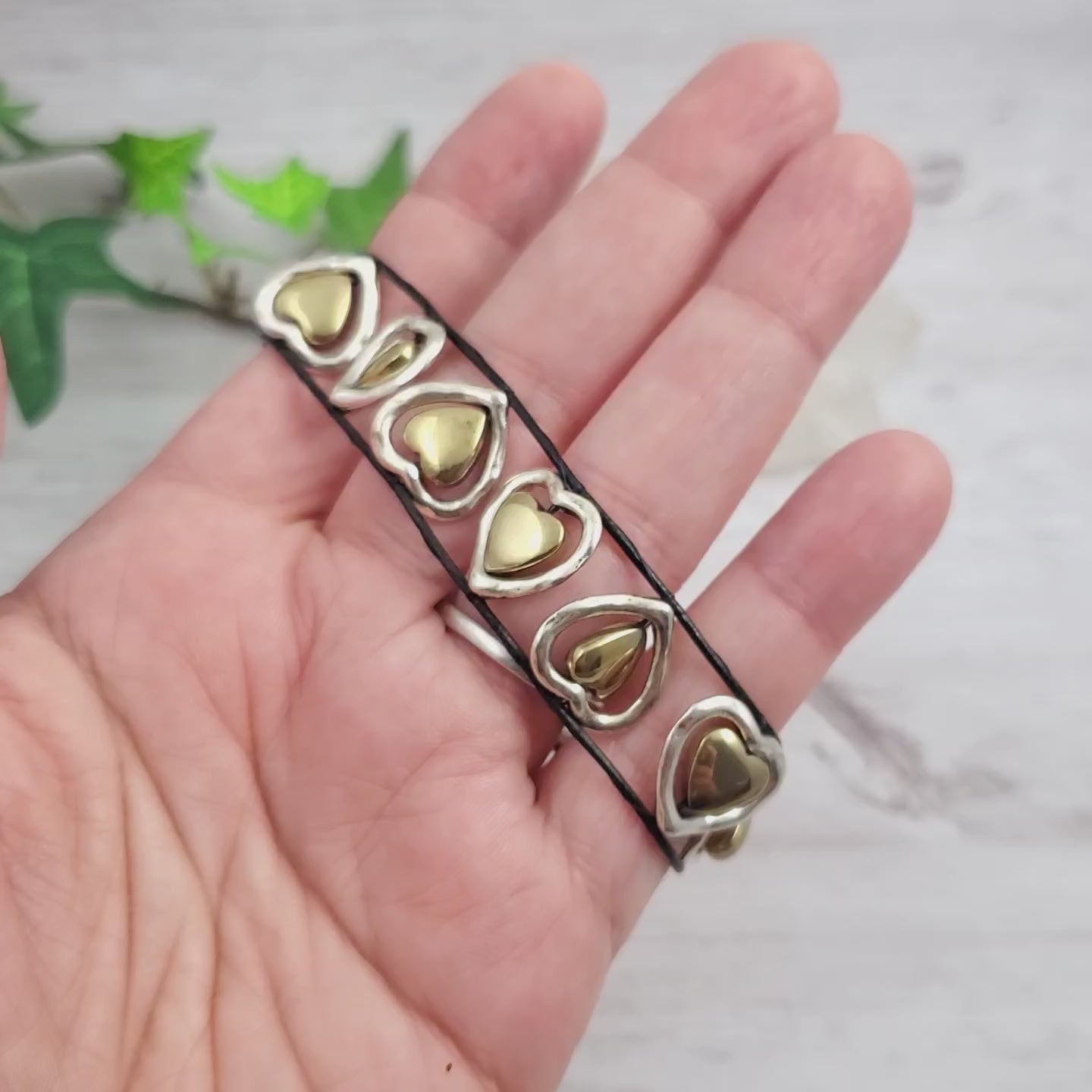 Striking leather bracelet has two-tone metal hearts - hematite hearts inside a silver-plated heart bead frame. The frame and beads spin, so great for fidgeting. Pretty flower button connector.